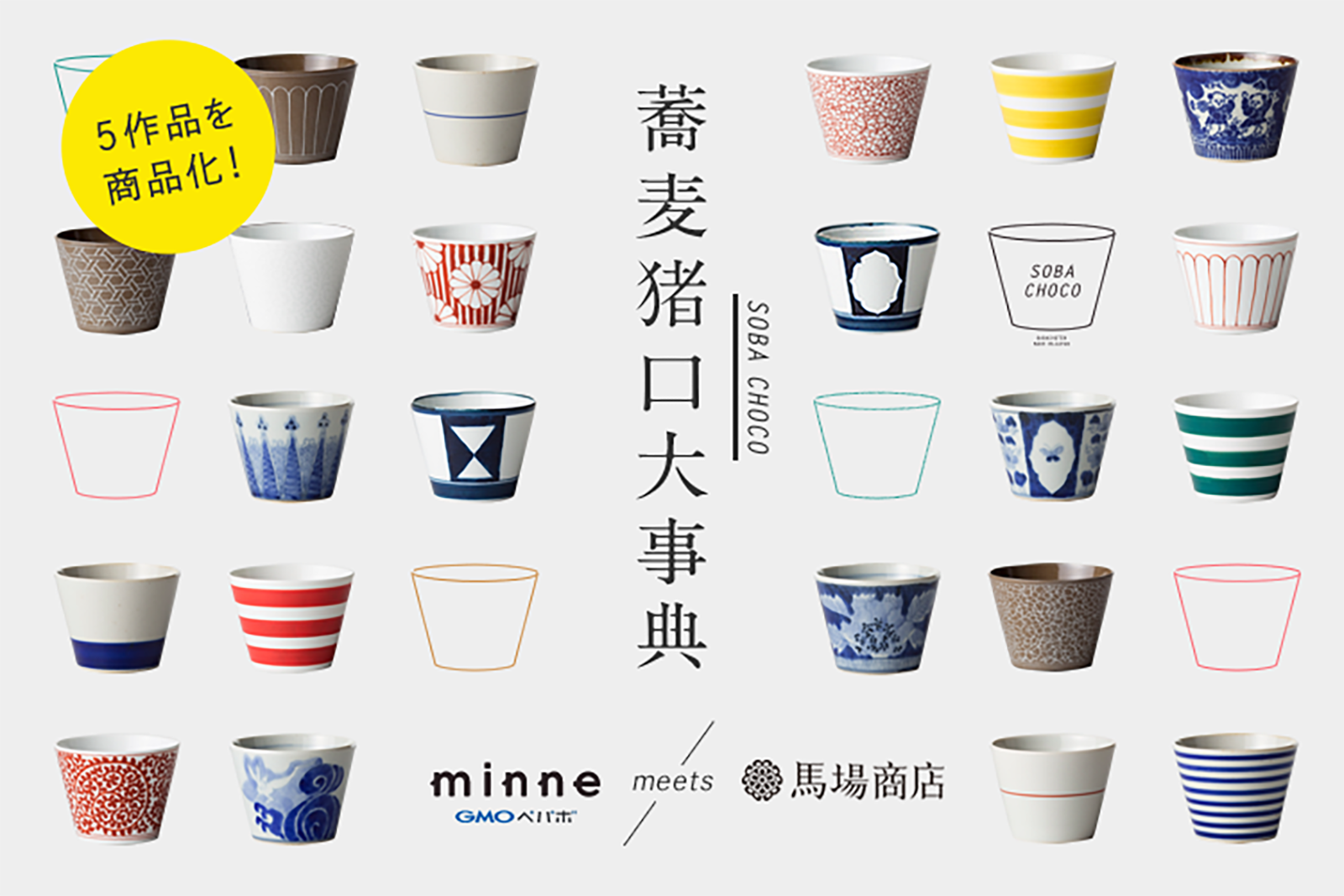 蕎麦猪口は、デザインを転写シートにして貼り付け、焼成する工程を経て完成します。そのため、他の食器と異なり、ある程度自由にデザインできることが特徴です。波佐見焼とminneのコラボレーションを検討するにあたり、蕎麦猪口の自由度の高さがクリエイティビティの余白であると考え、一般公募の企画を考えました。公募の結果、500案を超えるデザインの応募があり、その中から5つのデザインを商品化しました。