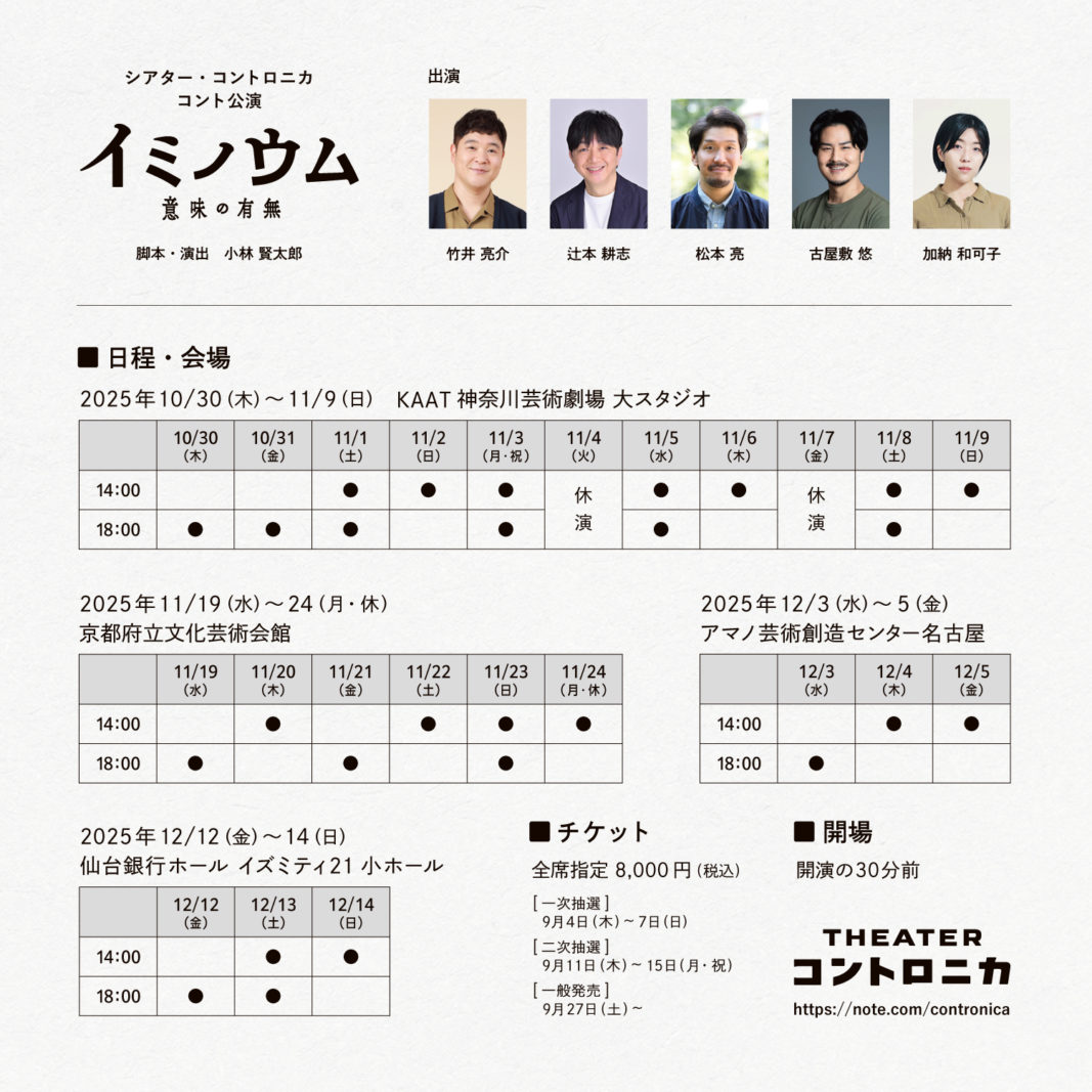 小林賢太郎さんが脚本・演出を手がけられたコント公演『イミノウム』の宣伝美術を担当しました。ビジュアルの企画段階から参加し、素案の作成と提案、情報構成のコンセプト設定、デザイン、および印刷ディレクションまで一貫して担当しています。
